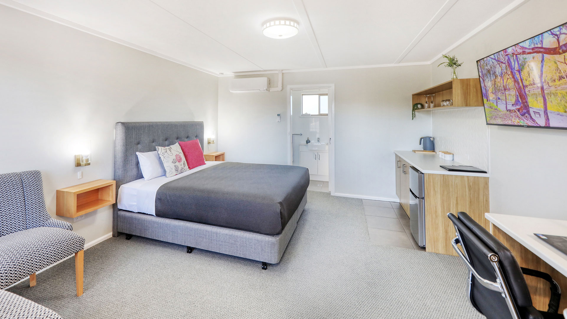 Newly refurbished King Suite, air conditioning, 50” Smart TV & kitchenette.