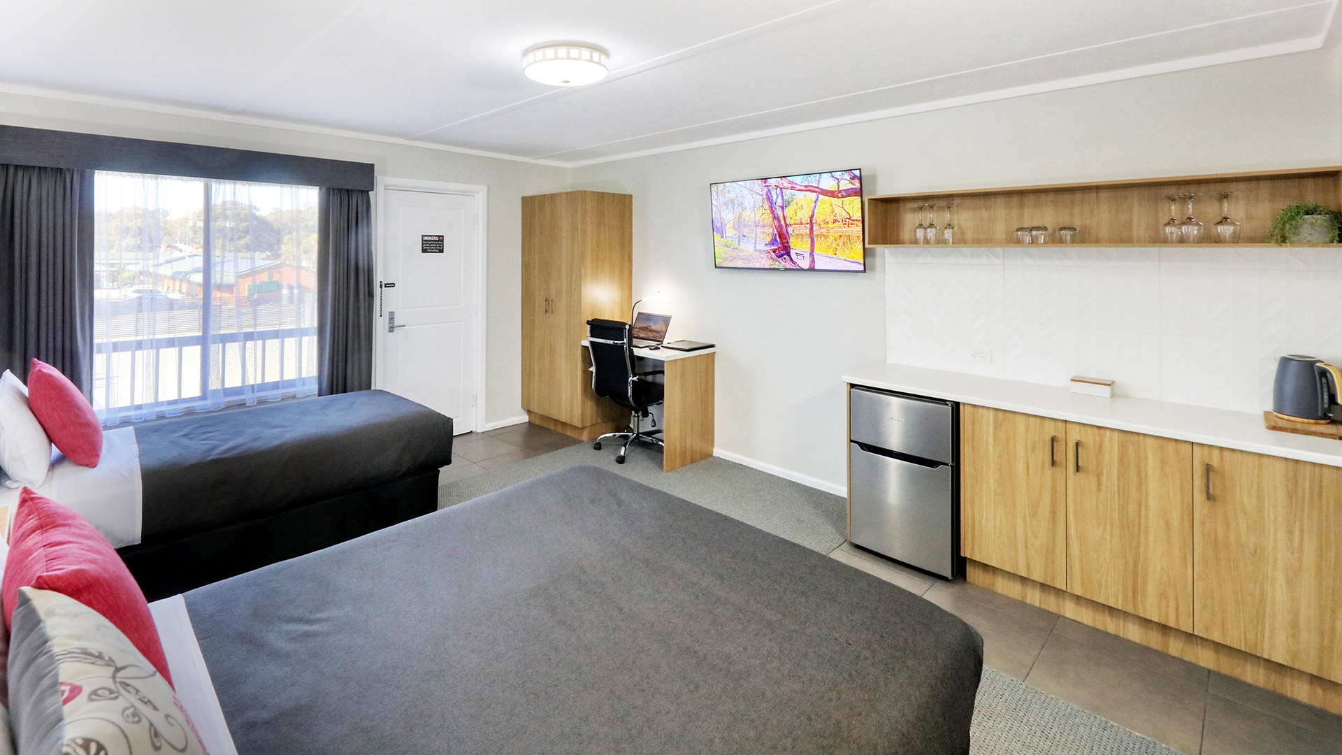 Fully refurbished twin room with a Queen Bed & a Single. Fully air conditioned, 50” smart TV & kitchenette.